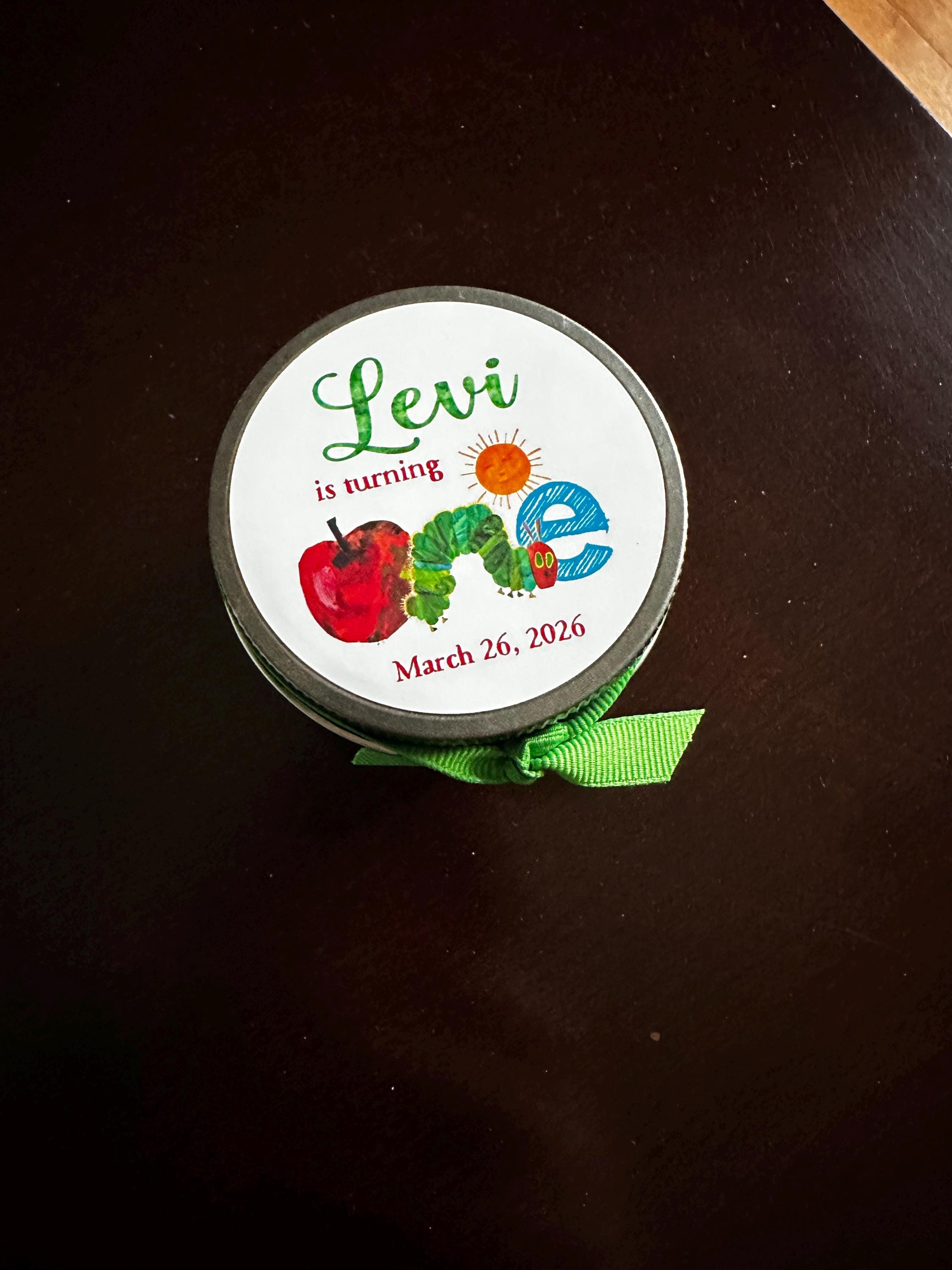 Celebrate your little one's milestone with these adorable Personalized First Birthday Candle Favors, inspired by a colorful caterpillar storybook theme. Featuring a vibrant caterpillar, apple, and sunshine design, these handmade soy candle favors are personalized with your child’s name and birthday to create a memorable keepsake for guests.
